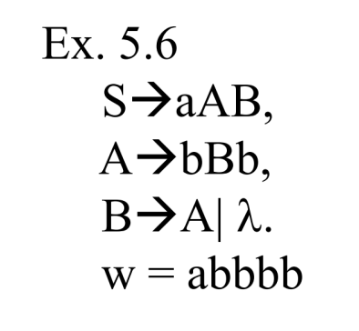 위와 같은 문법이 있고, w = abbbb 가 주어질 때, 이 문장을 유도하는 derivation tree 를 그려보면
