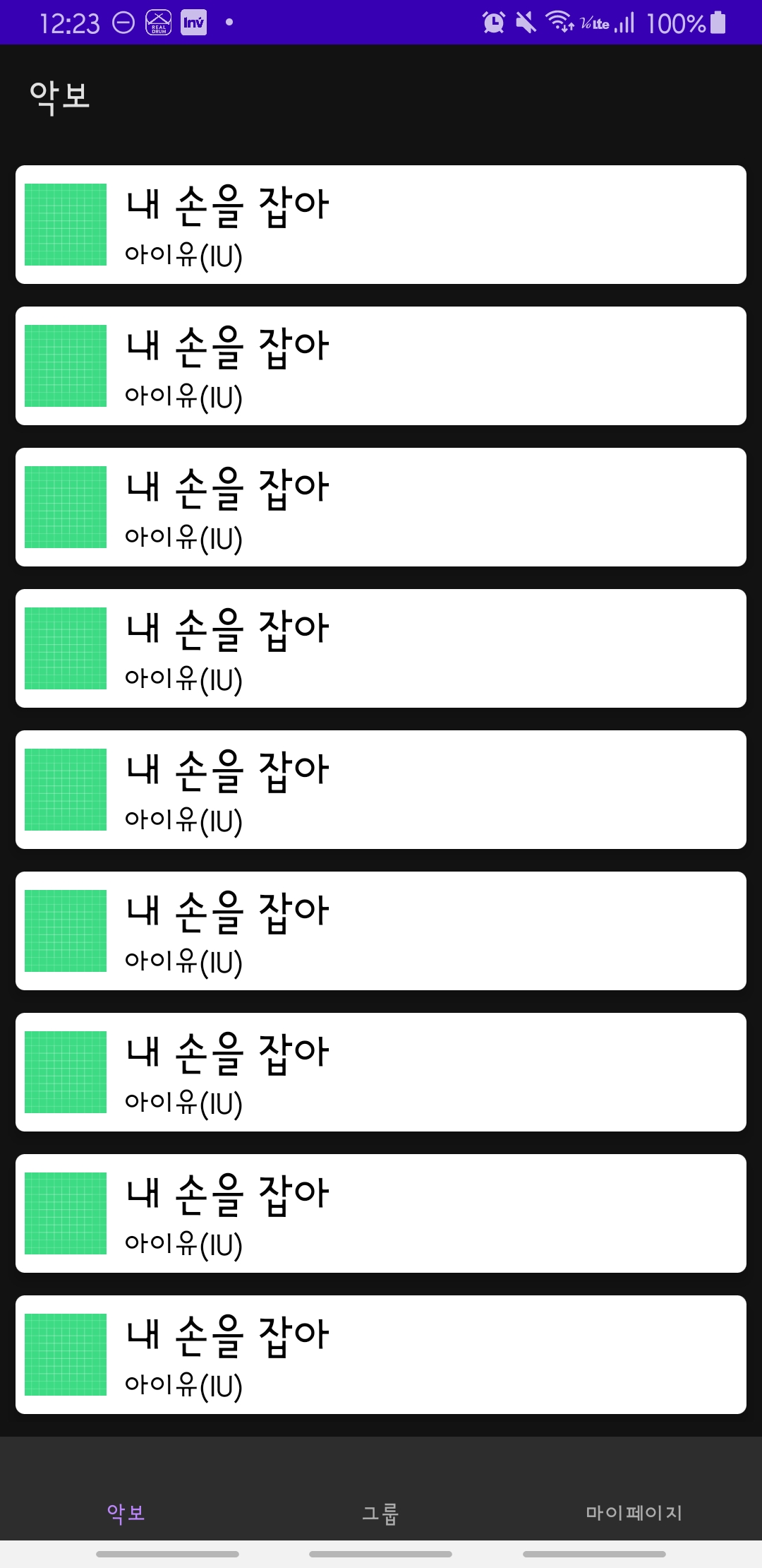 악보탭을 눌렀을 때의 화면이다.