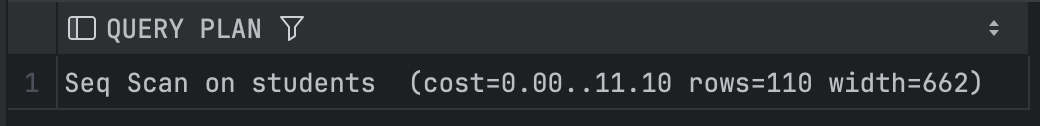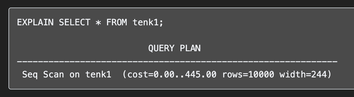 결과를 보면 괄호 안에 cost 항목이 존재한다. '..' 을 기준으로 앞의 항목과 뒤의 항목이 서로 개별 항목인데, 앞의 항목은 쿼리를 수행하기 위해 사전에 준비하는데 걸리는 시간, 뒷 시간은 최종 걸린 total 비용을 말한다.