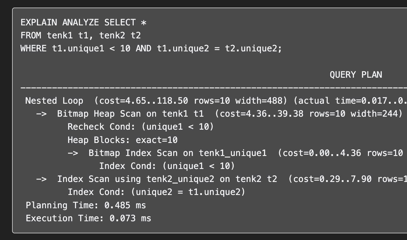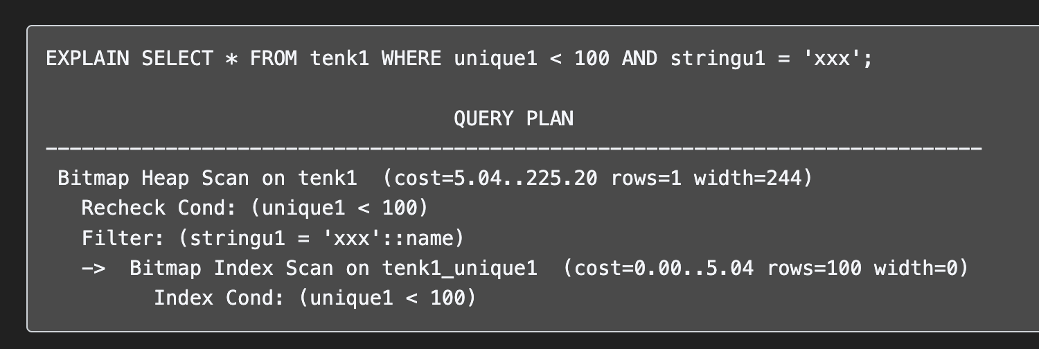 먼저 tenk1_unique1 필드에 대해 Bitmap Index Scan 을 걸어 unique1 < 100 조건을 처리하고, 그 다음 그 결과에 대해서 stringu1 필드에 대한 조건을 체크하며 tenk1 에 대해 인덱스 스캔을 한 것이다.
