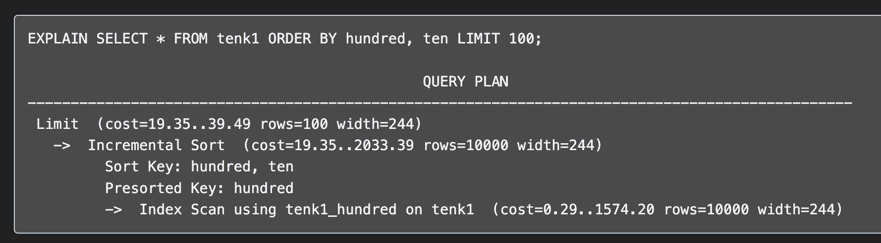 Incremental Sort 비용은 2033 이었음을 알 수 있고, Limit 까지 처리하는데 최종적으로 39의 비용이 들었음을 알 수 있다.