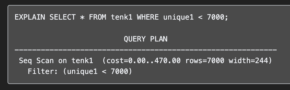 비용은 크게 변하지 않았다. 똑같이 full scan 하면서 unique1 조건만 그때 그때 체크해서 거르면 되기 때문이다.