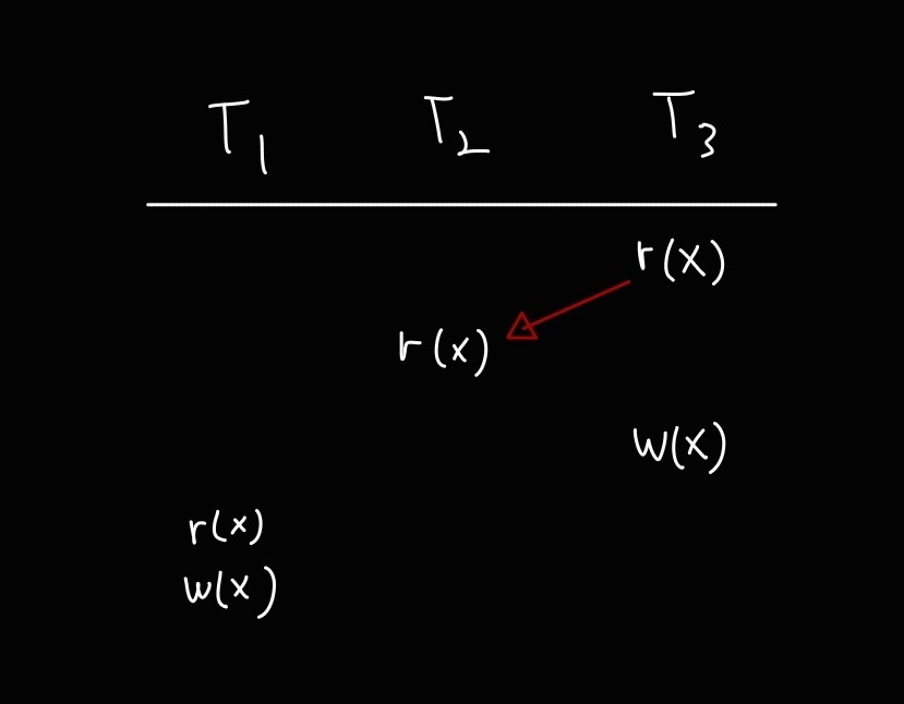 다음으로 시간순을 따라가면 T2 read → T3write 가 나온다. 이에 대해 T2 → T3 의 간선을 만든다.