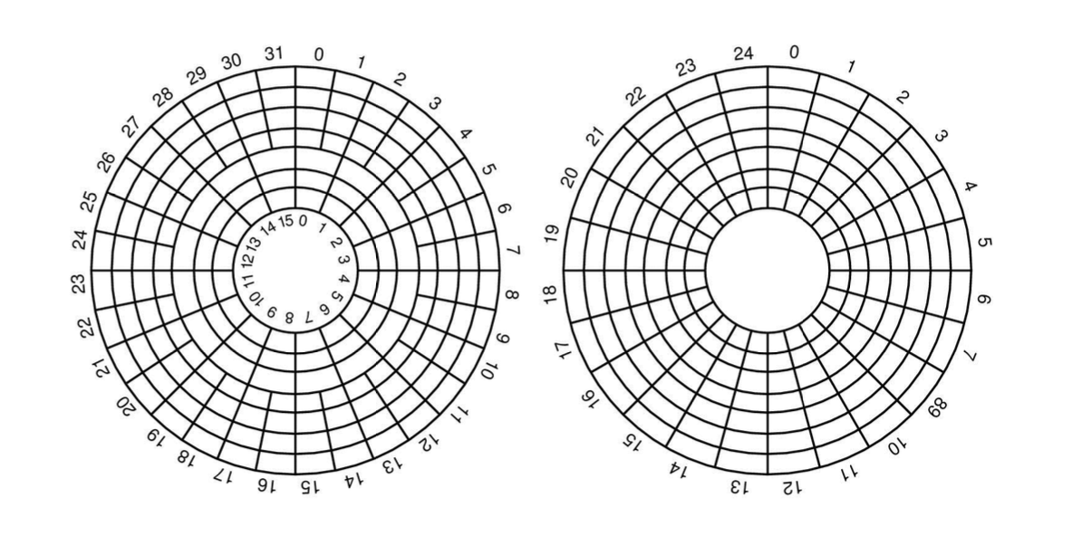 그리고 트랙은 중앙을 향하는 세로선에 의해 분할된 '섹터' 로 구성된다.