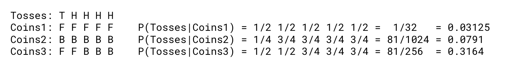결과가 THHHH로 주어졌을 때, 공정한 코인을 5번 쓴 경우 편향된 코인을 5번 쓴 경우, 2 / 3 씩 나눠서 쓴 경우의 확률이 다르다.