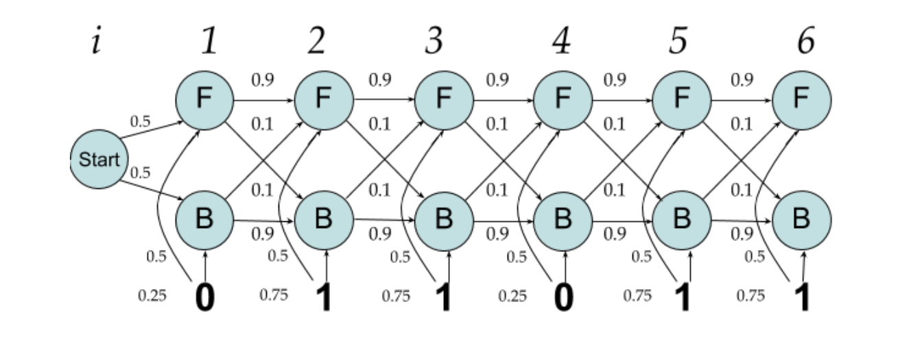 하지만 구하려는 확률 (전체 토스 결과 시퀀스가 주어질 때, 특정 위치에서 어떤 동전이 사용되었을 확률이 제일 높은지) 을 얻기 위해서는 forward 알고리즘 말고 backward 알고리즘도 필요하다.