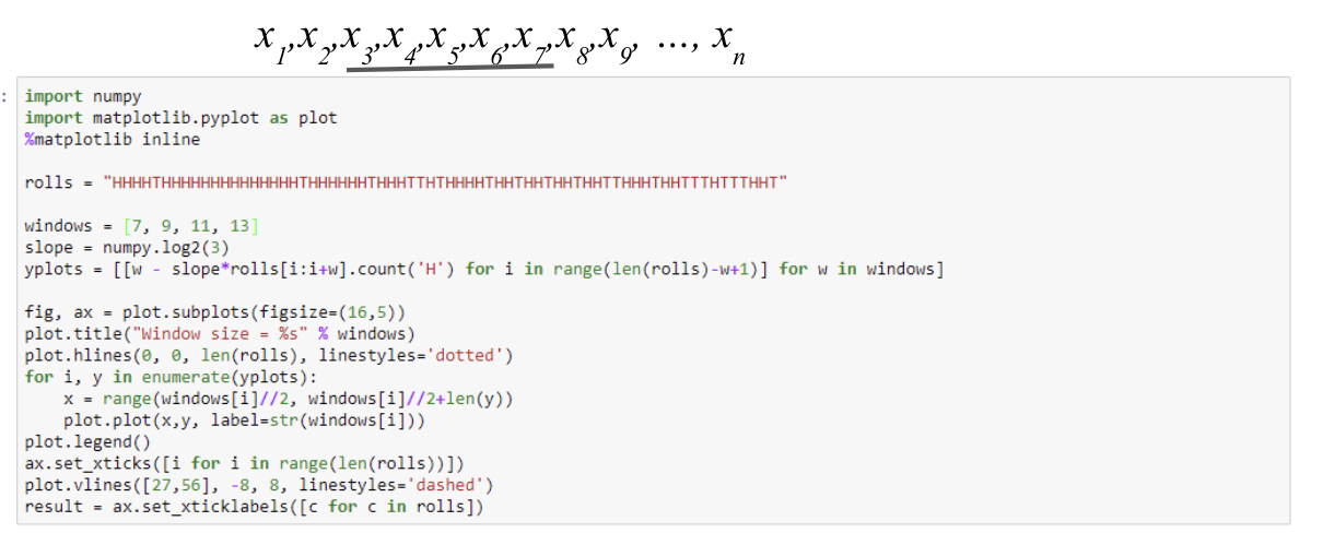 윈도우 크기를 임의로 정해놓고 다 구했을 때 7, 9, 11, 13 에 대해서 모두 이때는 편향된 코인이 쓰였을 확률이 높다고 말하면 (log-odd ratio가 음수면) 거기는 편향된 코인이 쓰인거고, 상대적으로 공정한 코인이 많이 쓰였다고 말하면 (log-odd ratio가 양수면) 거기는 공정한 코인이 쓰인 것이다.