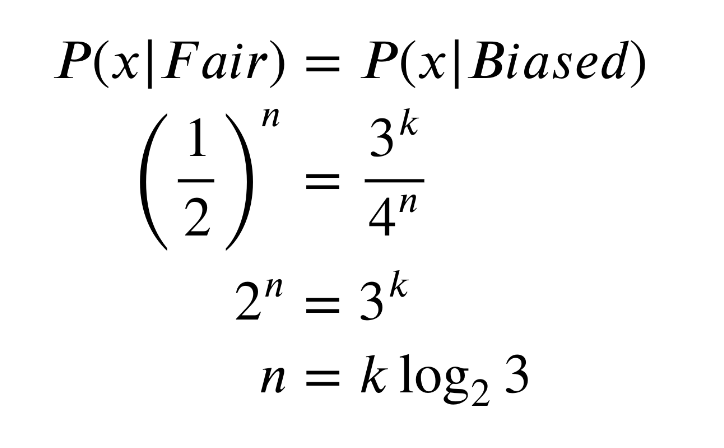 k = n / log_2 3 이라서 H가 63% 이상 등장하는 경우, 편향된 코인만 썼을 확률이 증가한다.