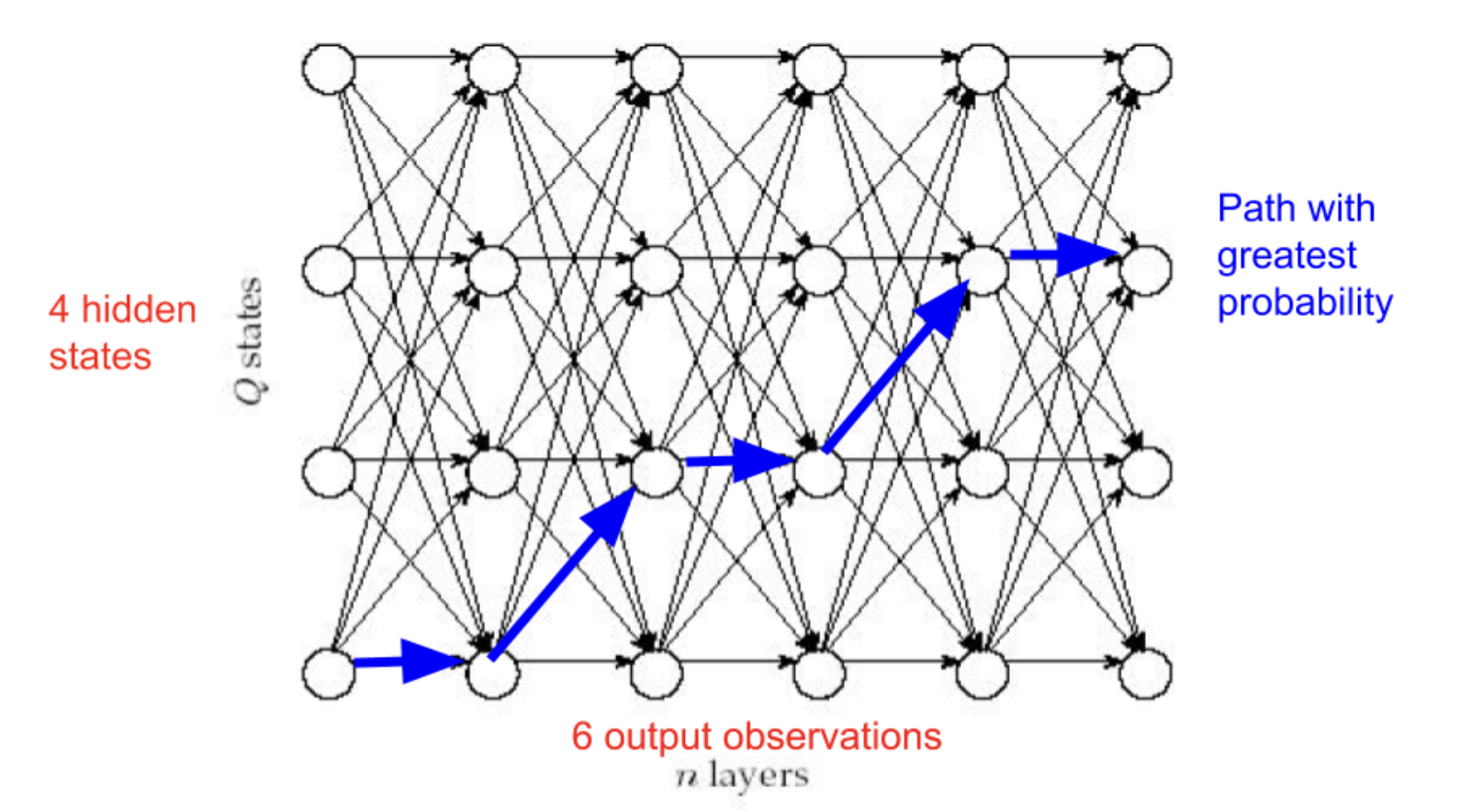 위 그림은 4개의 숨겨진 상태가 있고, 6개의 결과가 주어질 때 최적의 경로를 찾는 문제로 생각할 수 있다.