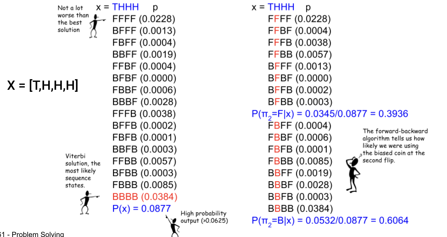 왼쪽 그림은 THHH를 도출하는 가장 높은 확률을 갖는 동전 사용 조합을 찾는 HMM을 보여주고