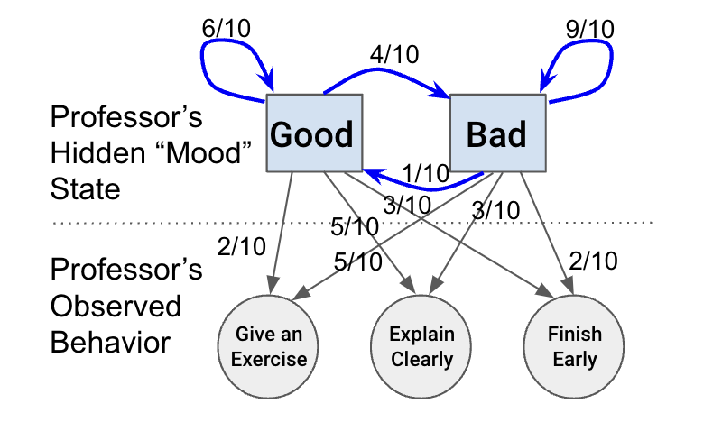 교수님의 기분이 좋은 상태 / 나쁜 상태 일 때의 따라 연습문제를 풀지, 명확하게 설명할지, 수업을 일찍 끝낼지 확률이 달라진다고 할 때 이를 이렇게 그림으로 표현한 것이다.