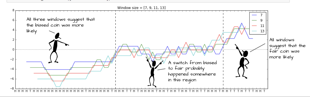 윈도우 크기를 임의로 정해놓고 다 구했을 때 7, 9, 11, 13 에 대해서 모두 이때는 편향된 코인이 쓰였을 확률이 높다고 말하면 (log-odd ratio가 음수면) 거기는 편향된 코인이 쓰인거고, 상대적으로 공정한 코인이 많이 쓰였다고 말하면 (log-odd ratio가 양수면) 거기는 공정한 코인이 쓰인 것이다.
