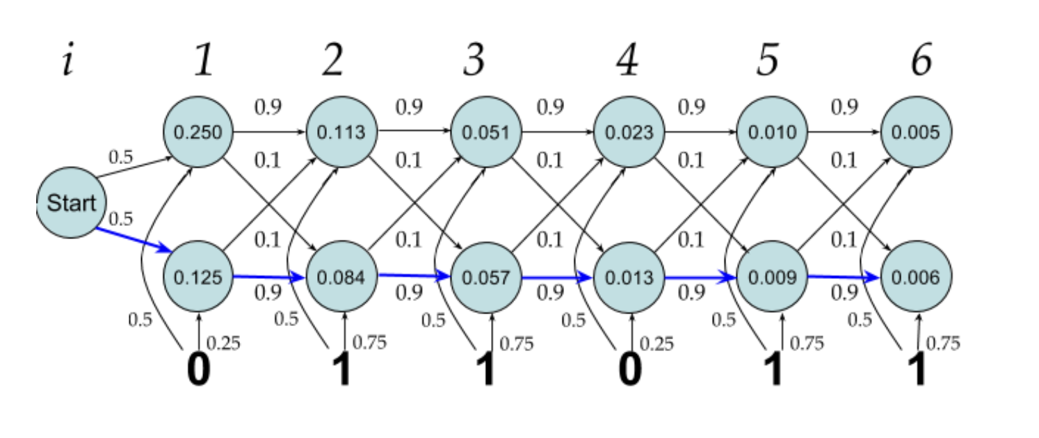 i 위치에서의 확률을 구할 때, i → i+1 로 상태가 어떻게 변화하는지, 어떤 결과를 내는지에 따라서도 값이 달라질 수 있기 때문이다.
