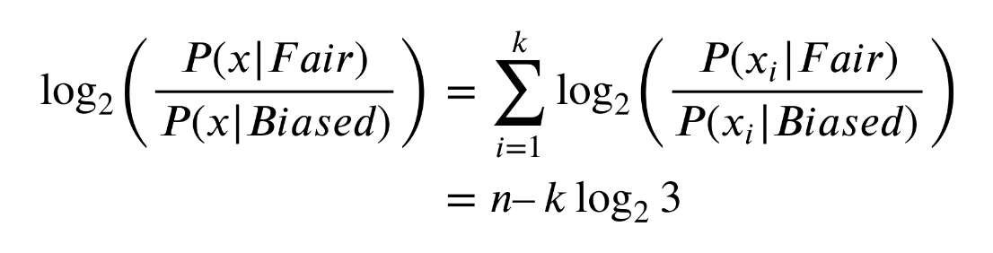 k = n / log_2 3 이라서 H가 63% 이상 등장하는 경우, 편향된 코인만 썼을 확률이 증가한다.