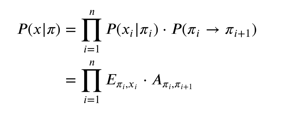 i번째 숨겨진 상태가 π 일 때의 그 결과 x가 나올 확률과 현재 상태에서 상태가 변경될 확률을 곱한 것을 모든 i 에 대해 곱한다.