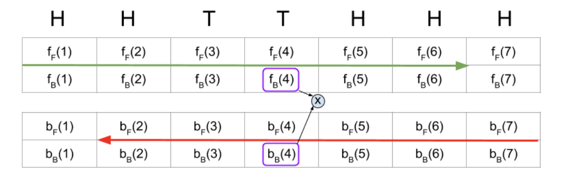 하지만 구하려는 확률 (전체 토스 결과 시퀀스가 주어질 때, 특정 위치에서 어떤 동전이 사용되었을 확률이 제일 높은지) 을 얻기 위해서는 forward 알고리즘 말고 backward 알고리즘도 필요하다.