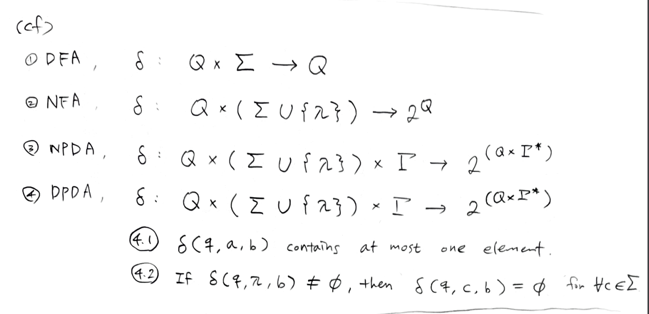 NPDA는 트랜지션 함수를 정의할 때 모든 상태와 모든 심볼, 모든 스택 심볼의 조합에 대해서 subset 에 대해 정의하면 됐다.