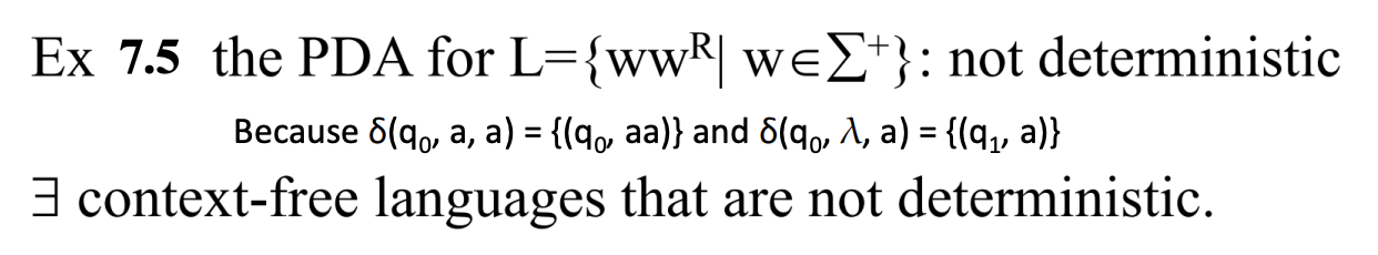 하지만 결론적으로 예제 7.5가 만드는 언어는 아무리 노력해도 NPDA로 밖에 표현이 되지 않고, DPDA는 존재하지 않는다.