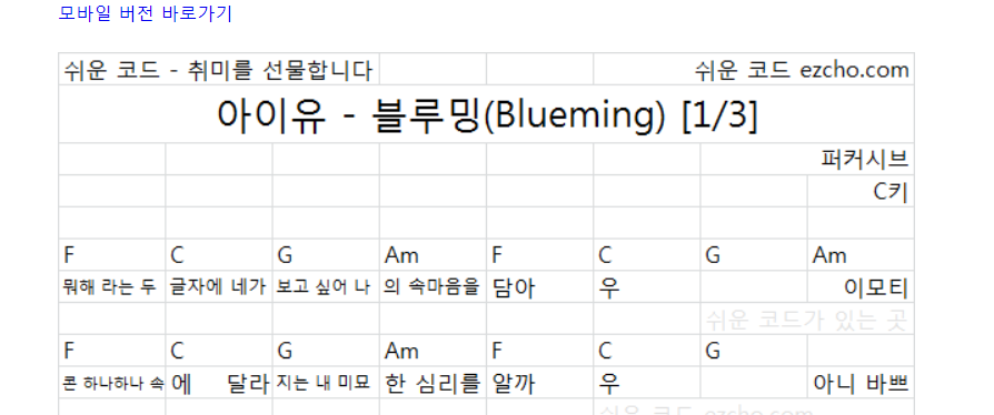 아이유 - 블루밍(Blueming) 카포 : 없음 박자 : 퍼커시브 키 : C키 모바일 버전 바로가기