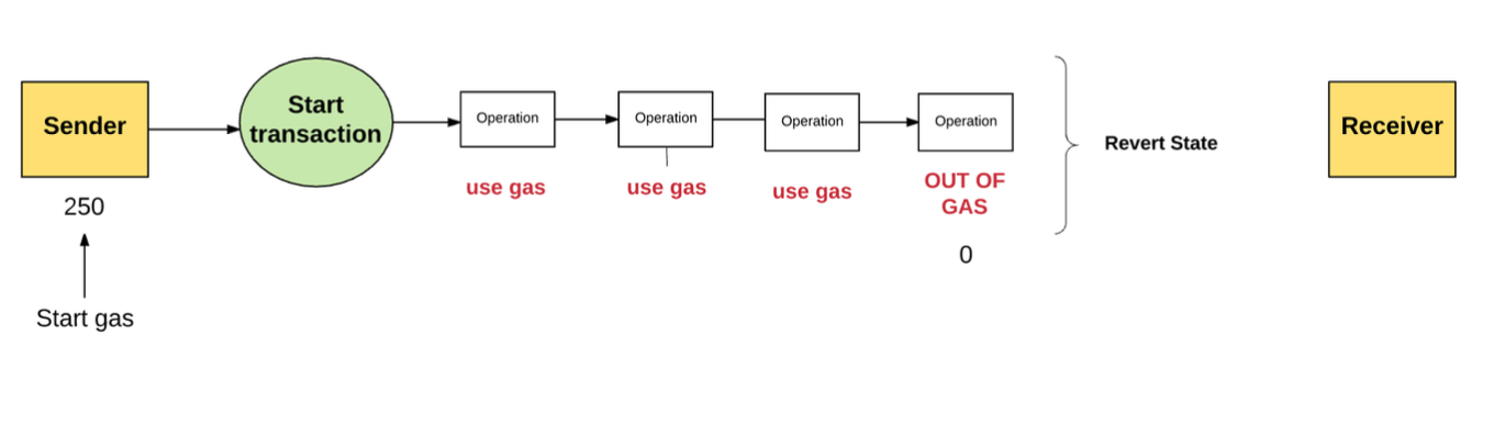 트랜잭션을 전송한 사람이 250 gas 를 설정했고, 각 operation 마다 gas를 소모하는데, 중간에 gas 가 다 떨어지면 이는 환불되지 않고 상태에는 아무 변화도 일어나지 않는다.