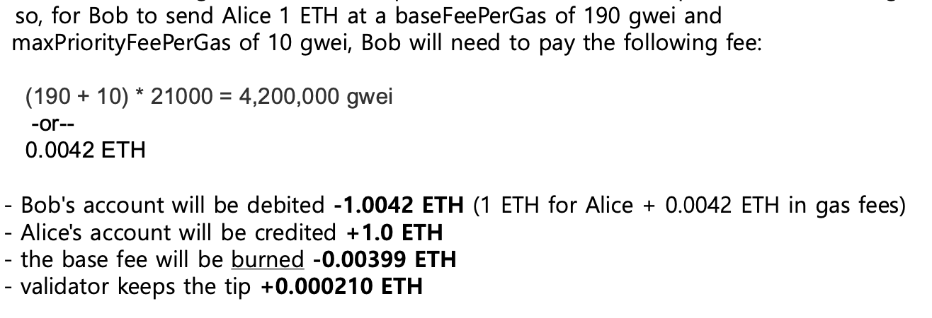 밥이 앨리스에게 1ETH를 전송할 때, 시스템이 결정한 base fee per gas 는 190 Gwei 였다고 해보자.