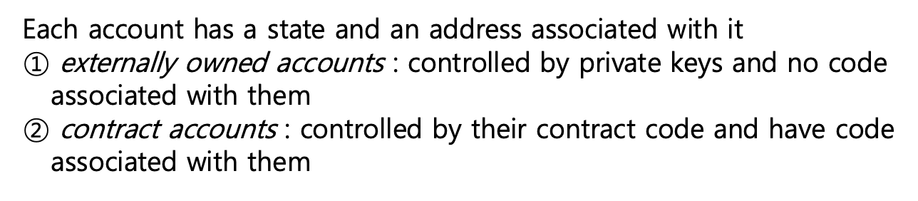 - externally owned accounts (eoa) : 스마트 컨트랙트를 갖고 있지 않으며, private key로 관리되는 account