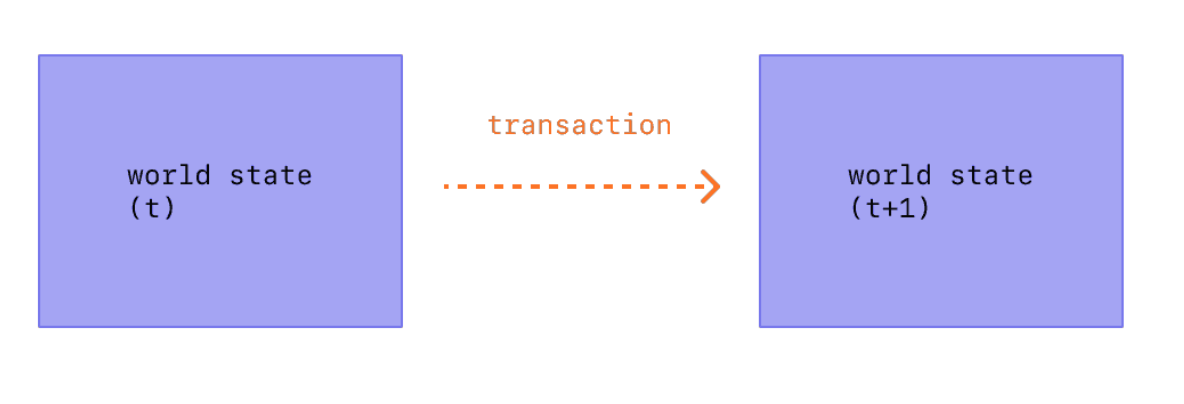 그래서 결국 하나의 트랜잭션은 world state 를 변화시키며, 이더리움은 여러 트랜잭션을 모은 블록 단위로 컨펌하기 때문에, 블록단위로 state 가 변화하게 된다.