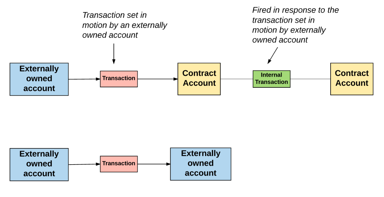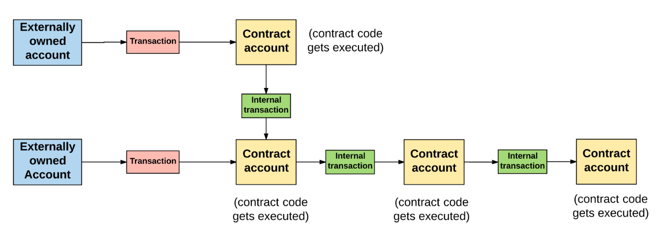 위 그림은 eoa가 ca로 트랜잭션을 보내서 invoke 시키는 것을 보여주고, ca는 internal transaction 을 통해 또 다른 ca를 invoke 하는 것을 보여준다.