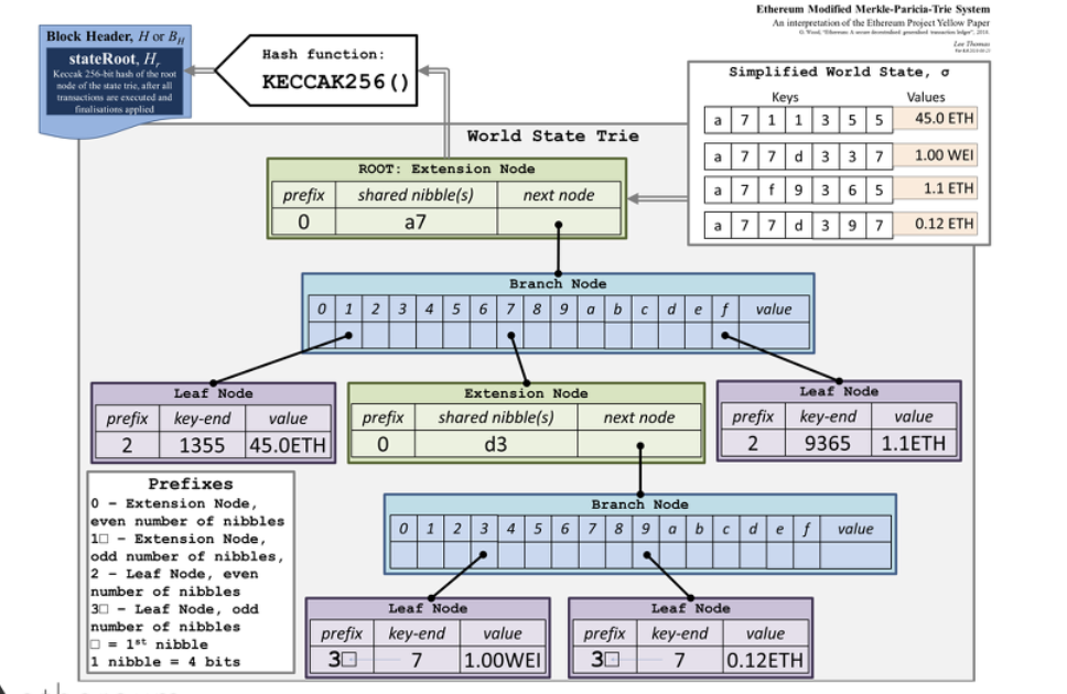 world state 를 보면 key(=account)가 a711355 이고, value(=주소에 저장된 현재 잔액) 로 45.0 eth 가 들어있다고 할 때, 이 정보를 빠르게 찾기 위해서 a7이라는 공통 항목을 가진 노드를 먼저 들어가고, 그 노드와 연결된 branch node 를 타고 들어간다.