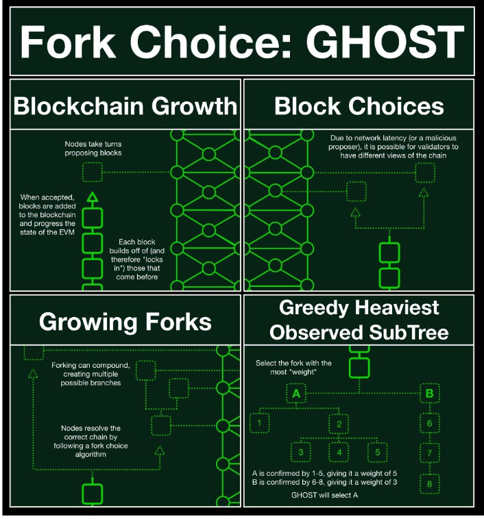 먼저 포크가 발생했을 때 어떤 블록을 고를지 선택하는 것은 GHOST (Greedy Heaviest Observed SubTree) 에 기반을 둔다.