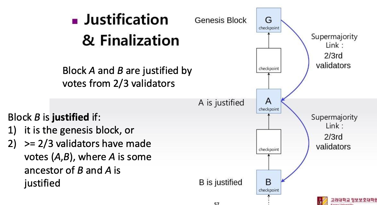 그리고 checkpoint 에서는 투표가 일어나며, 이 투표를 통해 블록이 justified 에서 finalized 로 변화한다.