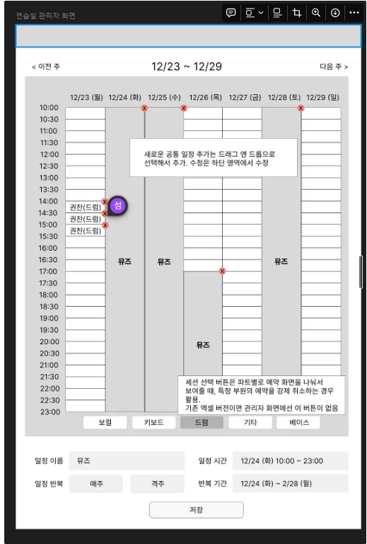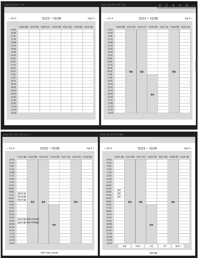 우리는 기존에 엑셀을 이용해서 연습실 이용 예약을 신청하고 현황을 조회했는데, 그 방식을 그대로 웹사이트에 옮기는 방향으로 기획해보았다.