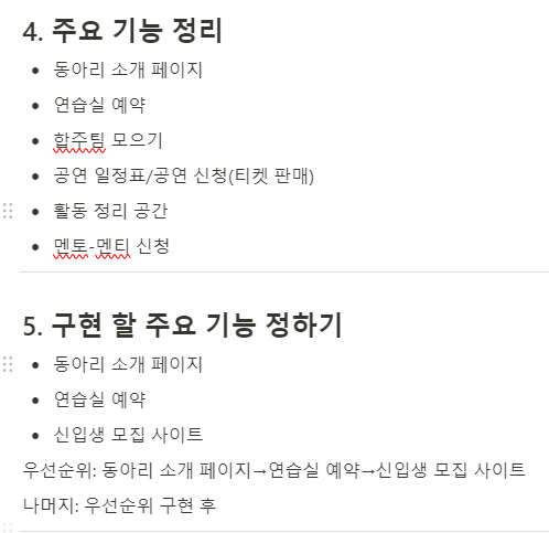 처음에는 러프하게 '웹사이트 있으면 좋겠다'. '연습실 예약 기능 있으면 좋겠다'.로만 가볍게 생각했던 기능에 더해 프로젝트를 통해 어떤 것을 만들고 어떤 문제를 해결하고 싶은지 논의하였다.