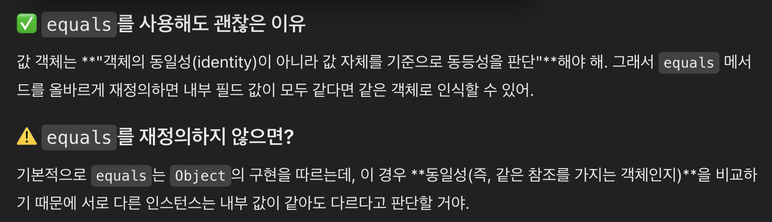 GPT는 값 객체를 비교할 때 equals 메서드를 오버라이딩 하는 것을 추천하고 있다.