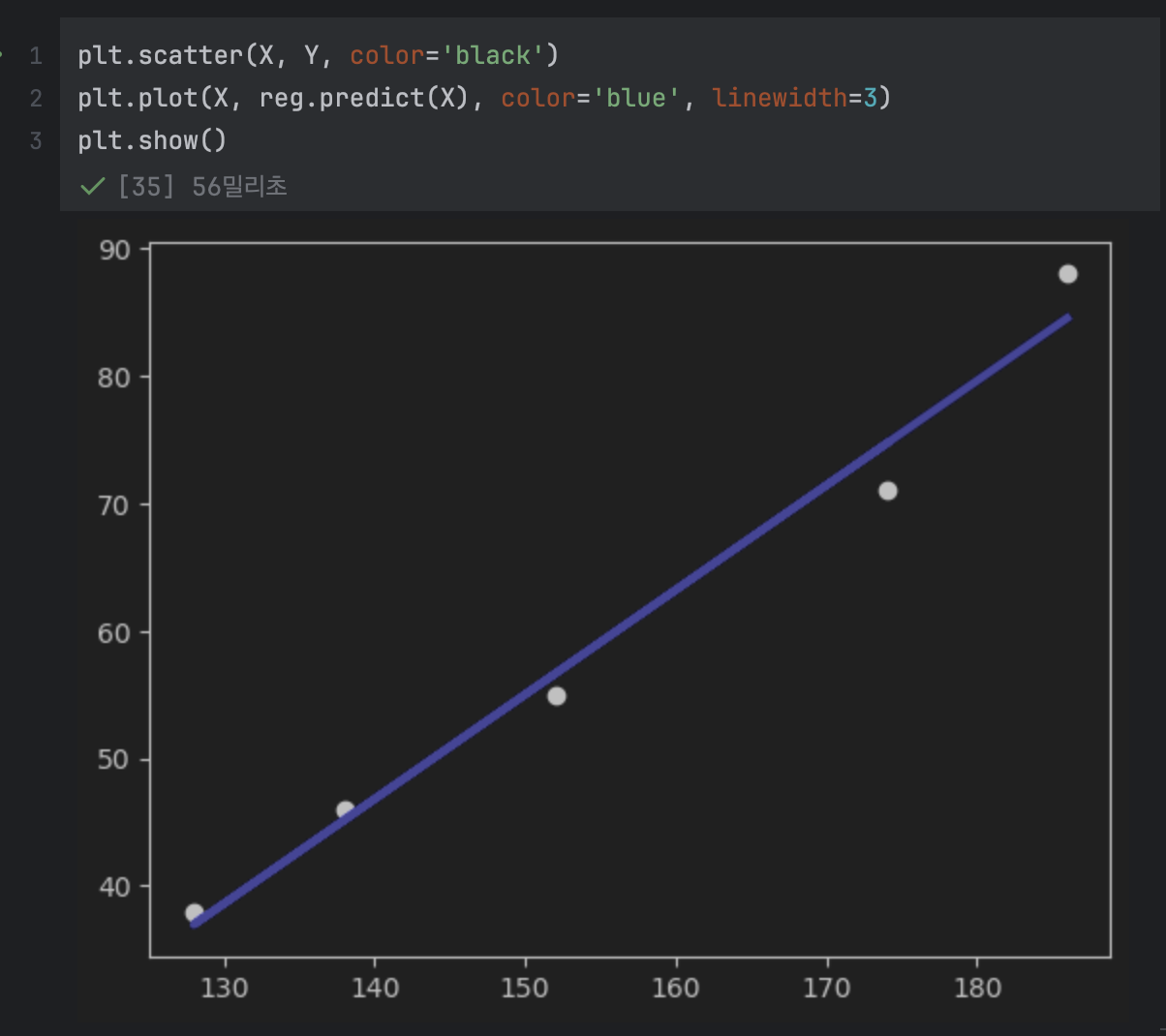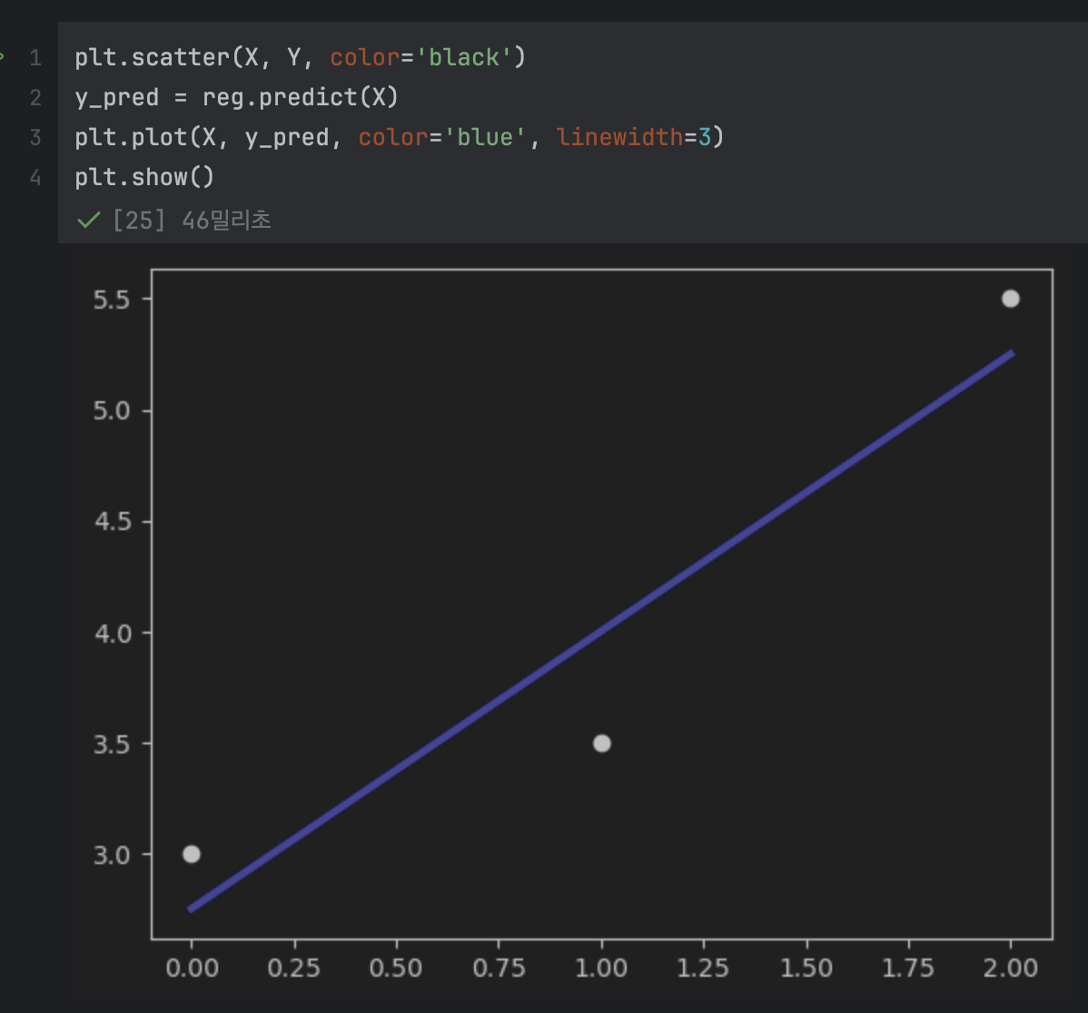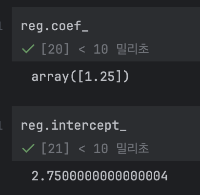 학습한 모델로부터 기울기와 y절편 값을 출력해보면 위와 같이 나온다.