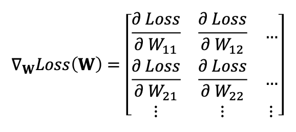 이때 행렬을 W 로 미분한다는 것은 Loss 함수를 행렬의 각 원소로 미분하는 것과 같다.