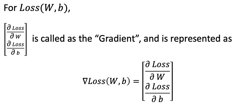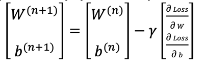 이때 learing rate 오른쪽에 곱해진 행렬을 보면 Loss 함수를 W, b 에 대해서 각각 미분한 것이 요소로 들어가있는 행렬임을 볼 수 있다.