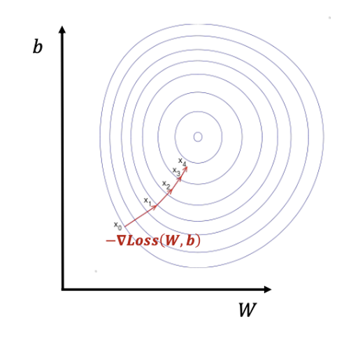그리고 매번 Gradient를 구하고 업데이트할 때마다, 우리가 구하는 것은 W, b 값 하나하나를 구한 것이지만, 그 값을 모은 (W, b) 포인트는 점점 안쪽으로 들어가게 된다.