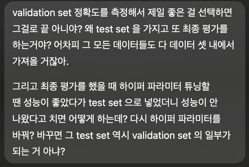 지피티 말로는 파라미터를 튜닝하는 과정에서 매번 똑같은 validation set 을 가지고 튜닝했기 때문에 어쩌면 이 모델은 그 validation set 에 잘 맞는 하이퍼 파라미터로 튜닝되었을 수 있기 때문에 이를 검증하기 위해 test set 이 별도로 필요하다고 한다.
