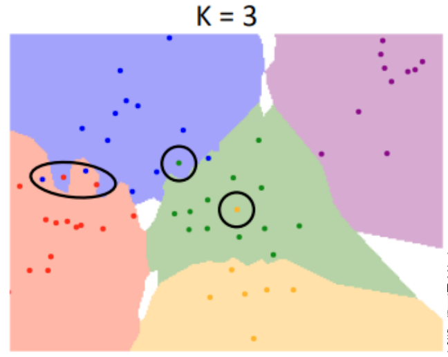 k 값이 1보다 커지면 이렇게 동점이 생겨서 어디로 분류해야 할 지 모호해지는 영역이 생긴다.