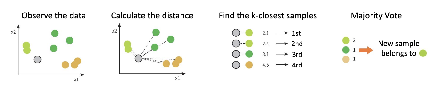 그리고 그 거리를 정렬해서 제일 가까운 순으로 k개의 데이터를 뽑아서 그들이 속한 class 에 투표하여 제일 높은 득표수를 얻은 class로 분류한다.