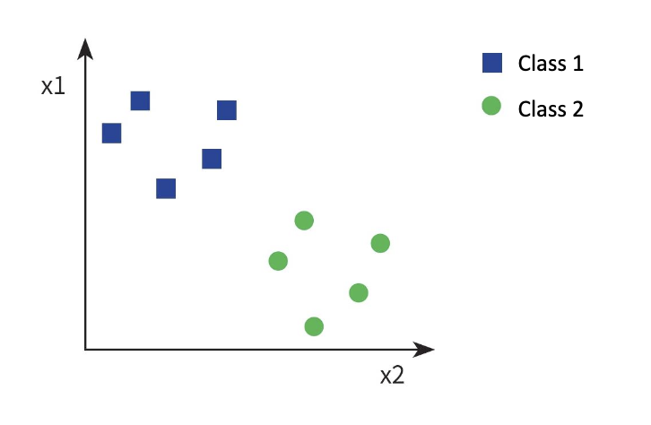 각 데이터는 (x1, x2) 라는 특성을 갖고 있고, 자신의 특성값에 따라 class 가 결정된다.