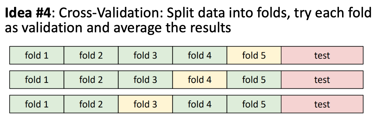 따라서 위와 같이 데이터를 fold 단위로 쪼개고, validation set 을 fold 중 하나를 고르는 방법을 취하면 특정 data set 에 맞춰서 하이퍼 파라미터가 튜닝되지 않도록 방지할 수 있다.