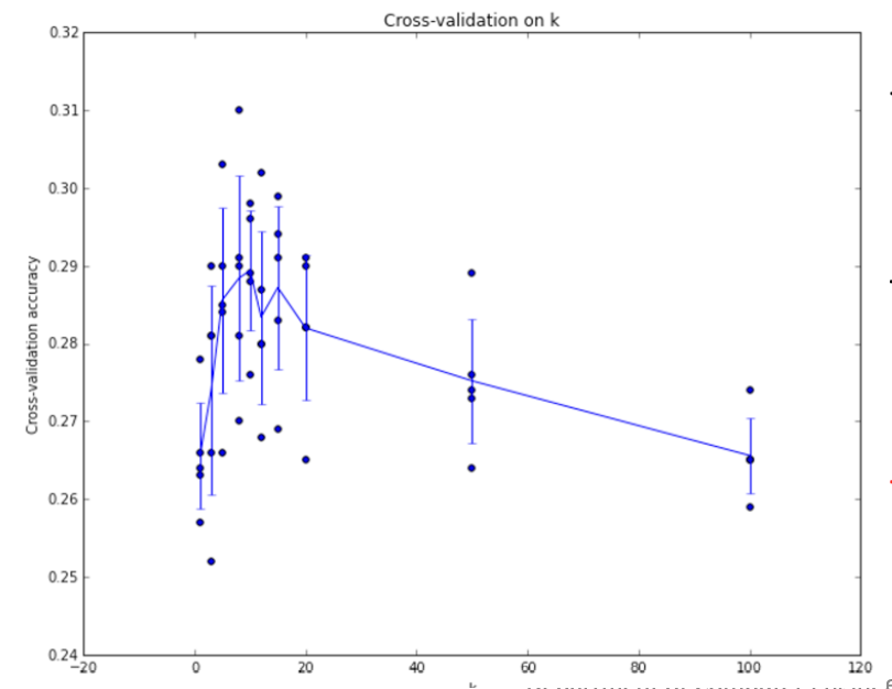 이 그래프는 5-fold cross validation 방식으로 kNN 알고리즘의 k 값을 튜닝한 결과이다.