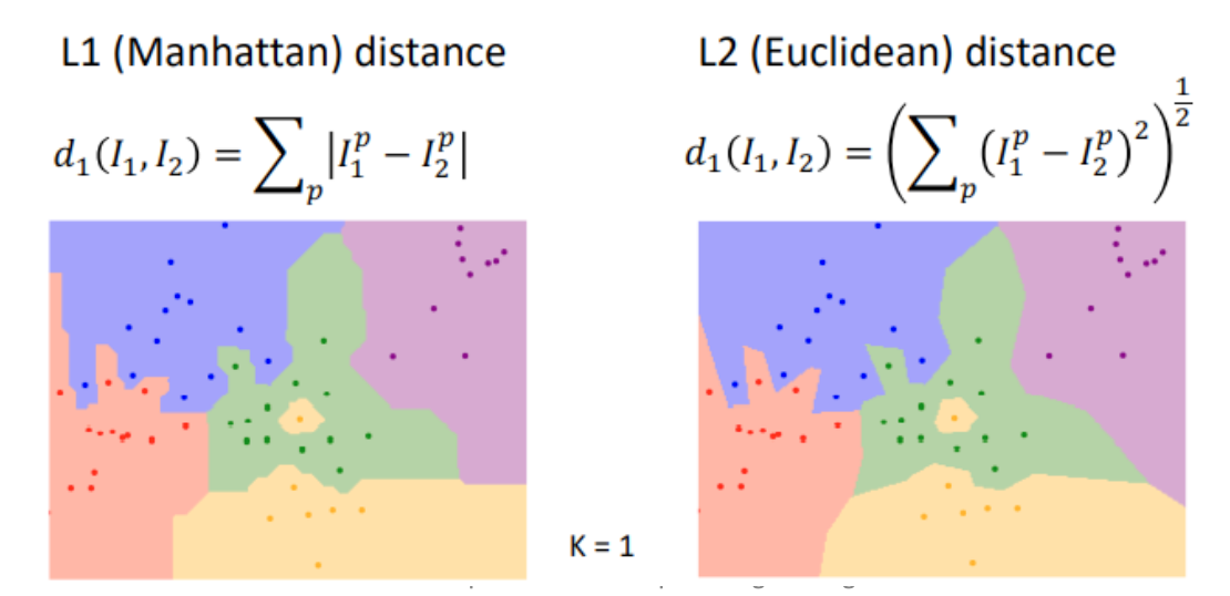 또 같은 k 값을 설정했다고 하더라도, 어떤 방식으로 거리를 구하는 지에 따라 영역이 조금씩 다르게 그려질 수 있다.