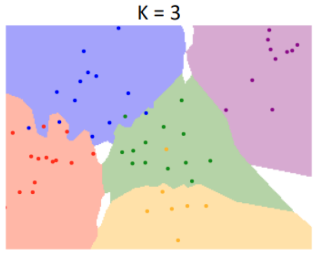각 점의 색은 그 점이 분류된 클래스를 나타내고, 배경색은 새로운 점이 해당 영역에 찍혔을 때 해당색의 클래스로 분류되는 영역을 나타낸다. 그리고 이렇게 영역을 그리다보면 영역과 영역 사이의 경계선이 그려진다.