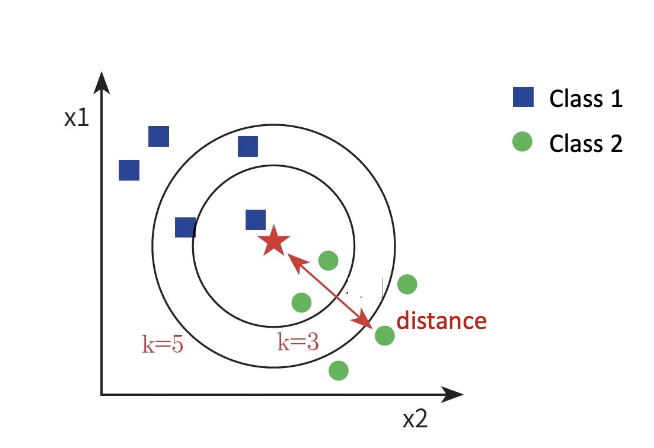 kNN 알고리즘에서는 이 데이터와 가장 가까운 데이터를 k 개 뽑고, 주변 데이터들의 class 를 확인해서 제일 많이 속한 class 로 이 데이터를 분류한다.