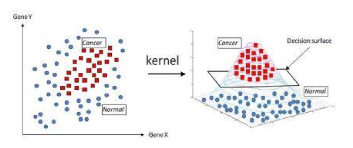 이때 '커널 메서드'는 비선형적으로 분포하는 데이터를 높은 차원으로 끌어올린다음 선형으로 자르는 개념이다.