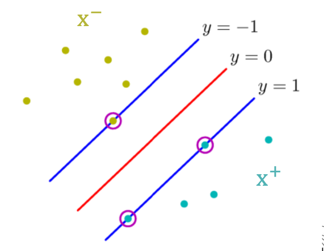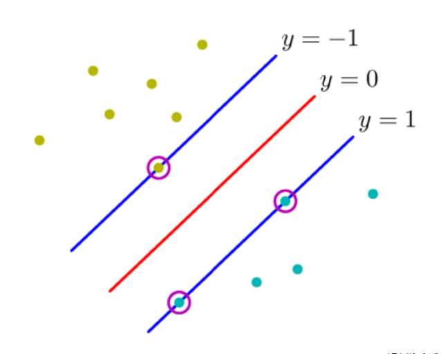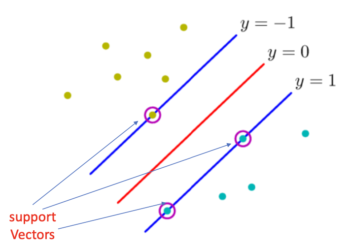 그리고 support vector들은 y = 0 인 기준선을 결정하는데 사용되며, 나머지 점들은 모두 무시된다.