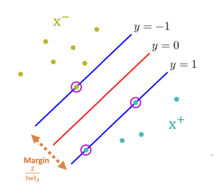 그러면 우리의 최종 목표는 이 마진값을 최대화하는 W, b 조합을 찾는 것이 된다.